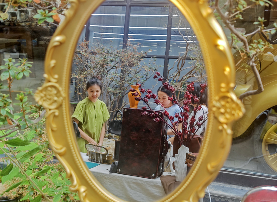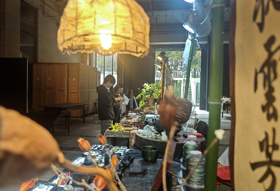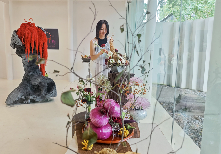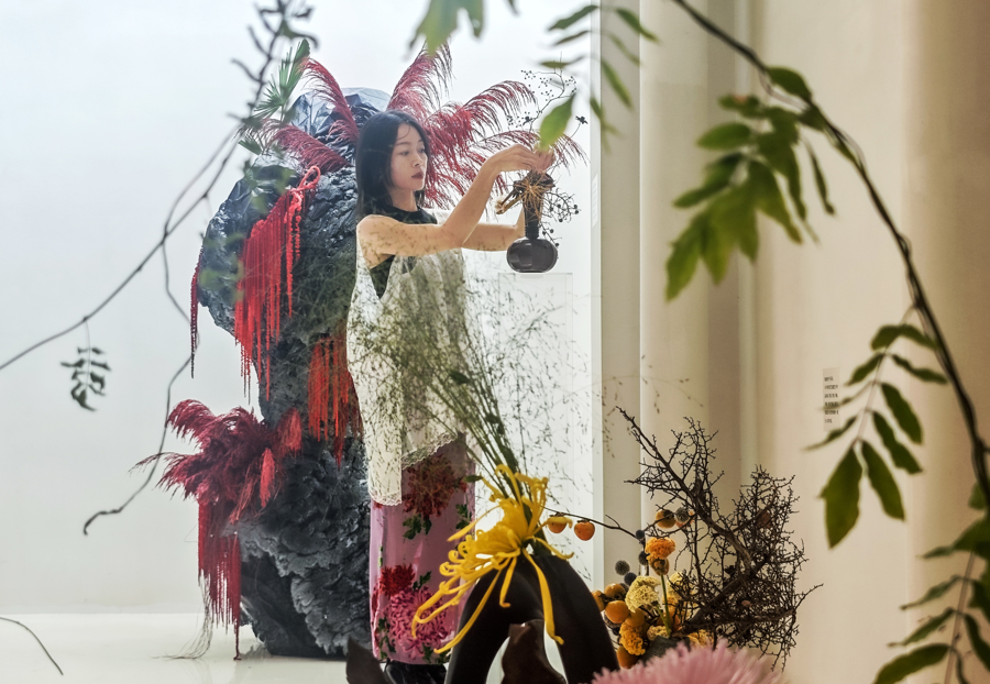 现场,“凝枝·露华浓”为主题的花艺装置展,以融合式插花风格展现充满东方美学的野趣。各类文创、首饰、茶具等产品展现了传统与现代元素的交织和碰撞。